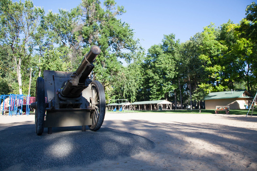 The City Park Cannon is a City Landmark, designated by City Council in 1997. This 5,000 pound cannon has been in the park since 1932, when the American Legion (George Beach Post #4) presented it to the City of Fort Collins as a memorial to Fort Collins residents who fought and died in the First World War. The meaning of the cannon has been debated by city residents over time, some finding it a fitting reminder of those military veterans who are no longer with us, and some viewing it as an unwelcome celebration of violence and warfare. Like many City Landmarks, it can mean different things to different people, but it has become a regular part of the City Park landscape.